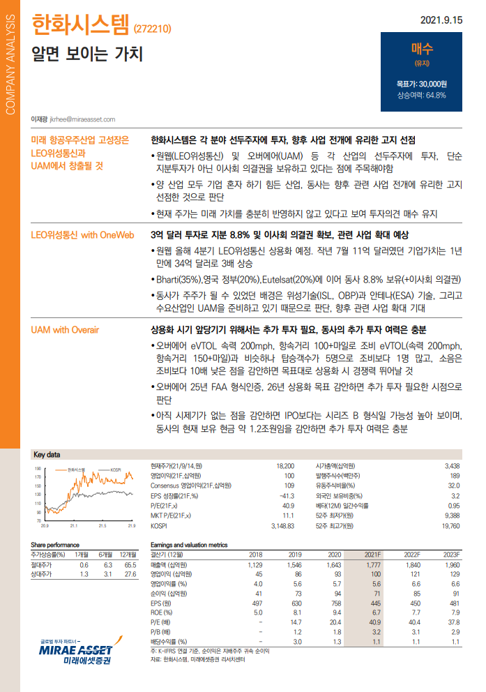 키움증권은 23일 한화에어로스페이스(012450)가 10월 예정된 한국형 발사체 ‘누리호’의 발사에 성공한다면 엔진 기술력을 재평가받을 것이라고 전망했다. 투자의견 ‘매수’와 목표주가 6만3000