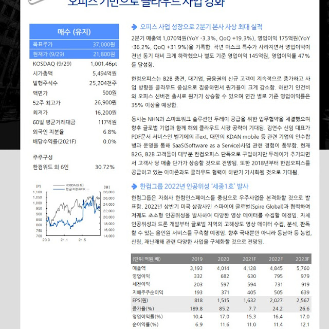 -한컴오피스는 B2B 중견, 대기업, 금융권 신규 고객 지속적으로 증가. 사업방향을 클라우드 중심으로 집중하면서 원가율 크게 감소. 하반기 인건비와 오피스 신버전 출시로 원가 상승 가능성. 연간 별도 기준 영업이익률 35% 이상 예상